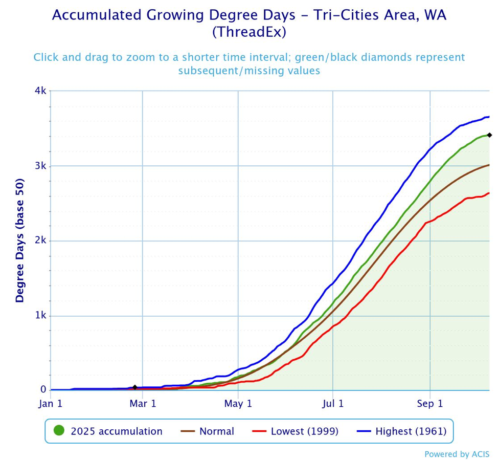 Growing Degree Days (GDD), a measure of heat accumulation, were above the long-term average, as shown in the map below. The green line is GDD for this year, and the brown line is the average. (GDD is calculated by subtracting a base temperature of 50 degrees from the average daily temperature and summing the positive differences over time.)